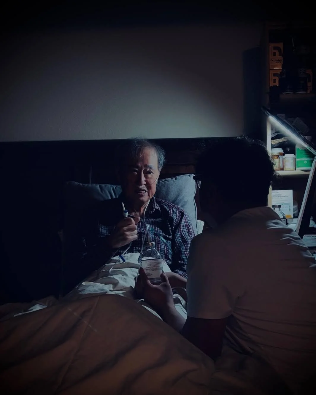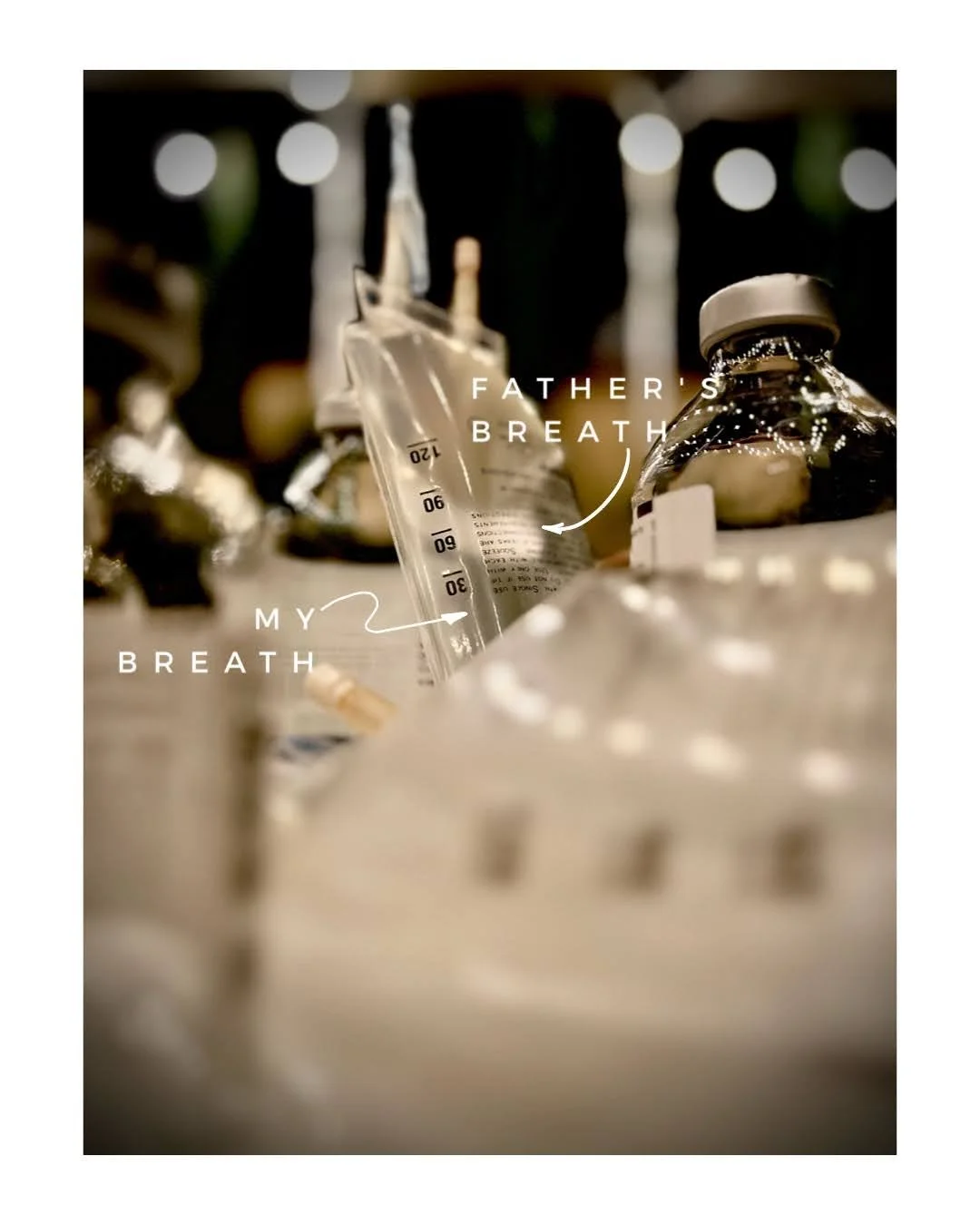 The vials were used as containers to preserve his and only his breath. In contrast, the four empty IV fluid bags are a bit more multilayered in that they were used to capture both my father’s breath and mine. As my father, weakened by his illness, struggled to fill the bags, I joined him and filled the rest with the air from my lungs. To me, filling the bags with our breaths represents life as a journey of shared space, a sacred dialogue between father and son, and a reminder of the cyclical nature of life. The bags full of our “PNEUMA” embody the reciprocity of care and support that defines the bond between parent and child.